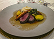 Upon seating for our five course dinner, we started with a winter salad of roast golden beets, pomegranate, Pemberton kale and a truffled goat cheese fritter paired with 2019 Gilbert Picq & Ses Fils Chablis Dessus La Carrière and followed by prosciutto wrapped sturgeon with brown butter celeriac velouté and spring salmon ikura and a 2021 Château Carbonnieux Blanc from Bordeaux.