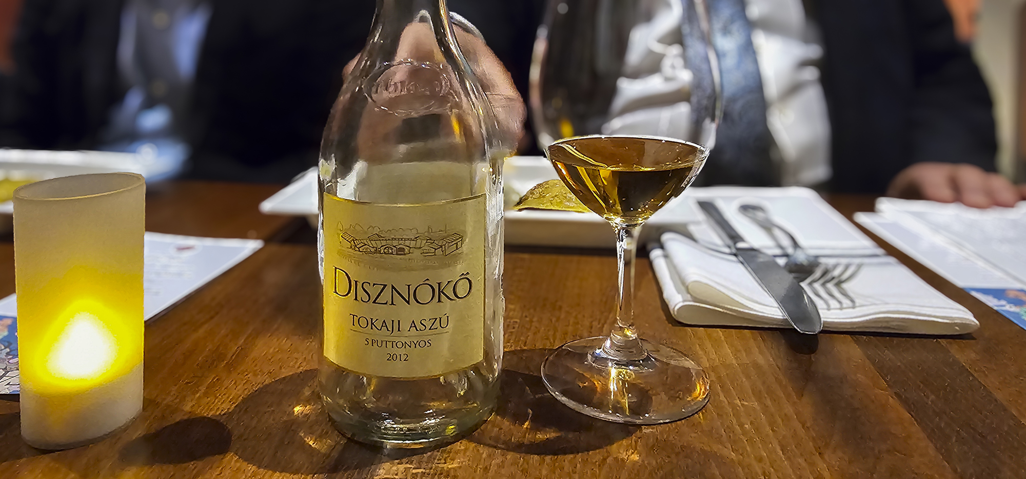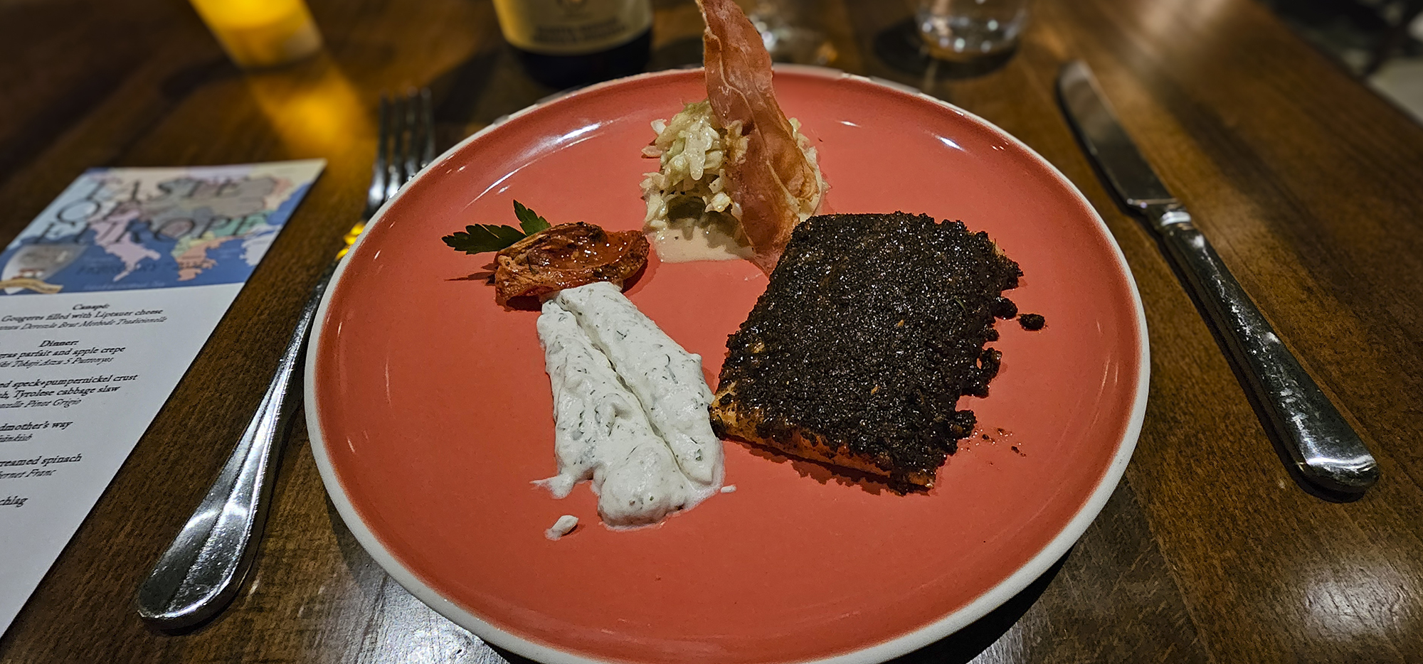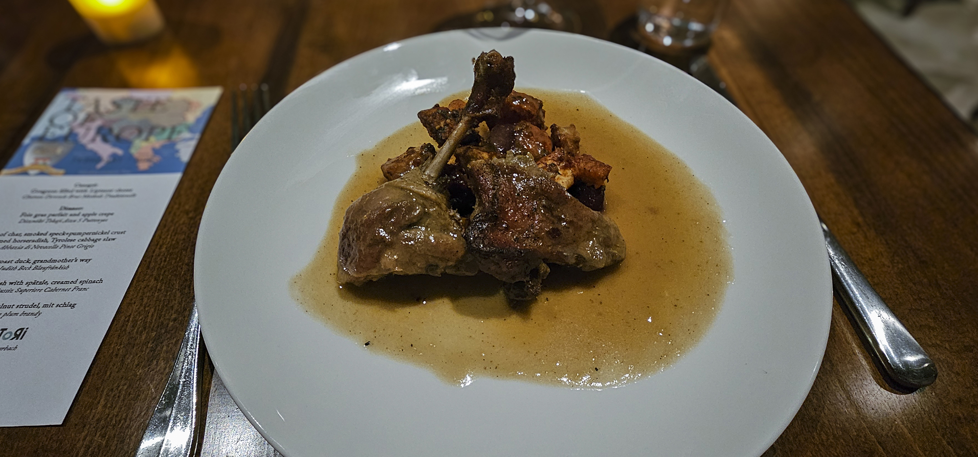We started with delicious Gougères filled with Liptauer cheese accompanied by a glass of Chateau Dereszla Brut Methode Traditionelle sparkling wine before sitting for our first course of Foie Gras Parfait and Apple Crèpe with a sweet Disznoko Tokaji Aszu 5 Puttonyos. Next up was a beautifully prepared Filet of Char with a Smoked Speck and Pumpernickel crust, creamed horseradish and Tyrolese cabbage slaw and a full-flavoured Abbazia di Novacella Pinot Grigio and Pot Roast Duck, Grandmother’s Way with Judith Beck Blaufränkish. Then came a Beef Cheek Goulash with Spätzle and Creamed Spinach and a glass of Marco Felluga Russiz Superiore Cabernet Franc, finishing with a Quark, Prune and Walnut Strudel mit Schlag and a tot of Old Falcon plum brandy.