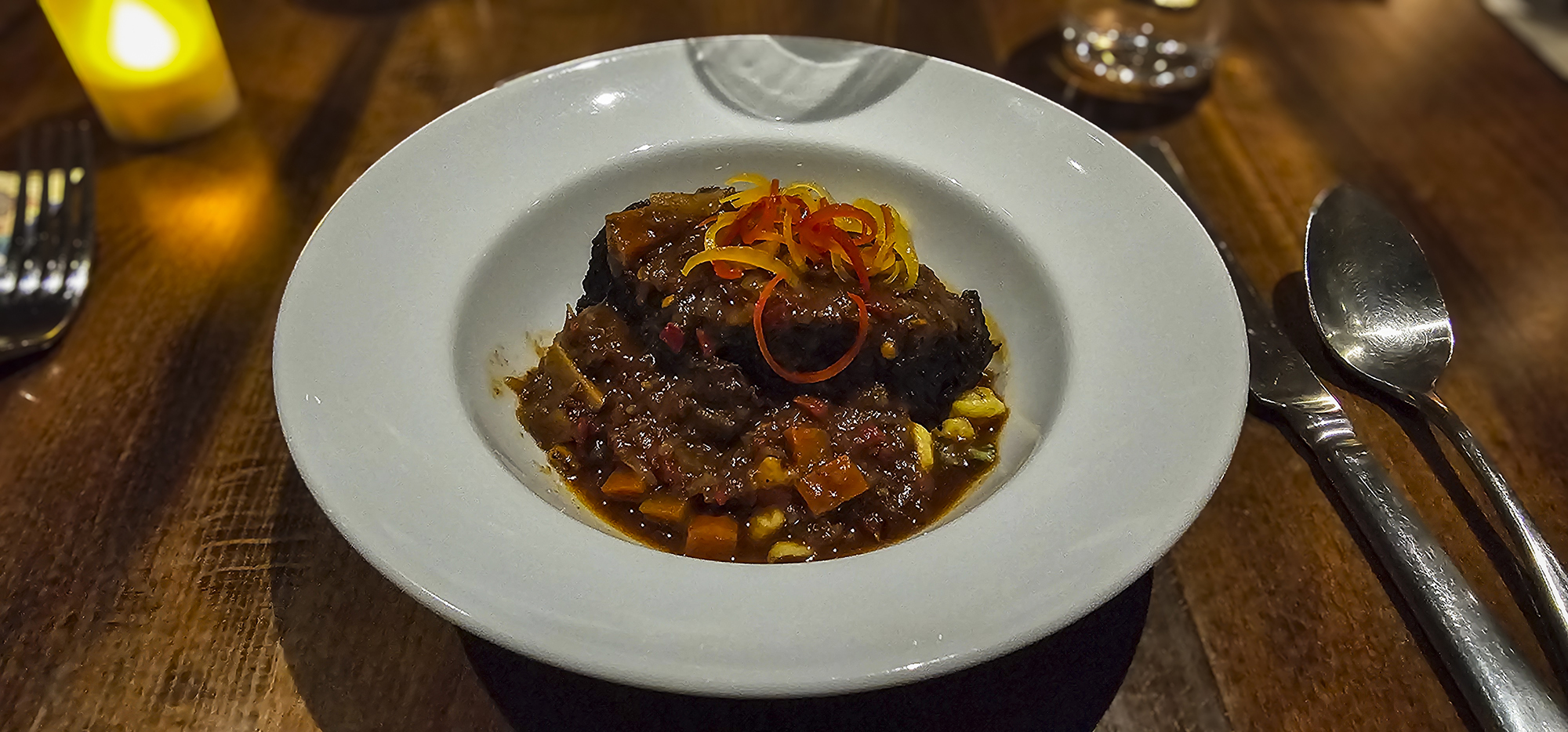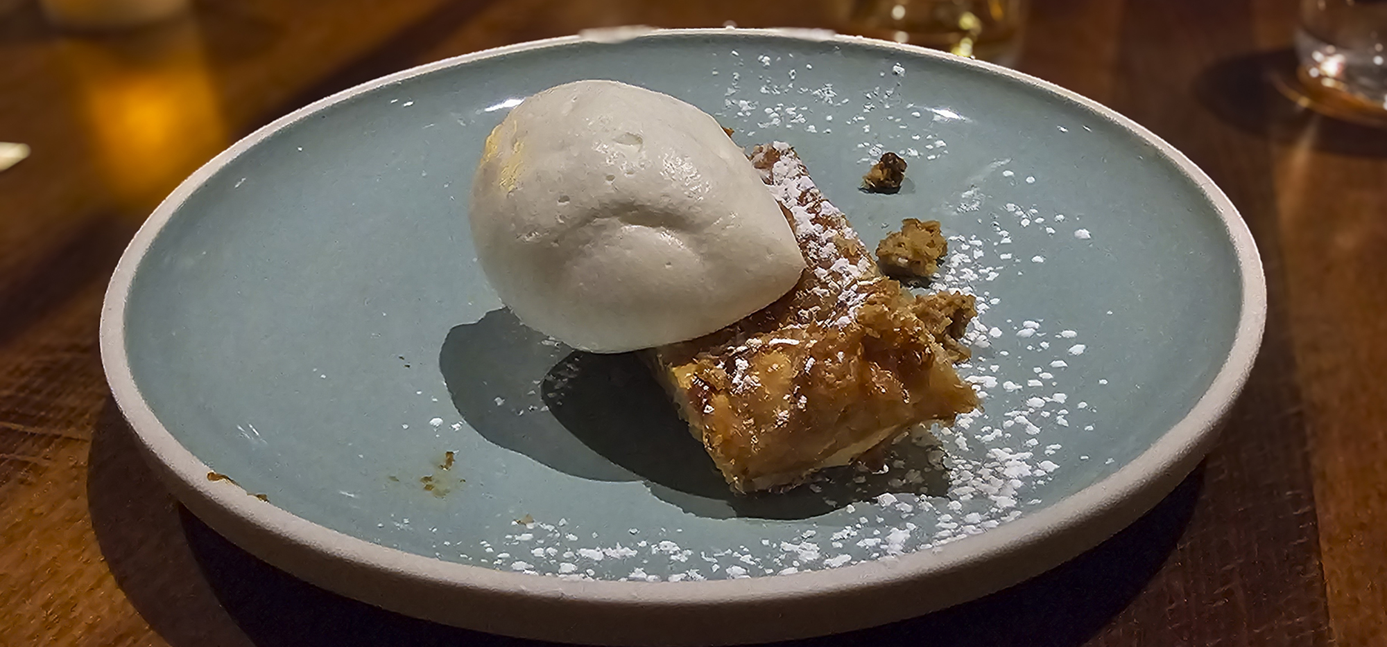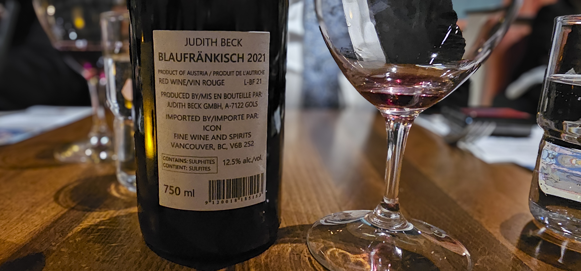 We started with delicious Gougères filled with Liptauer cheese accompanied by a glass of Chateau Dereszla Brut Methode Traditionelle sparkling wine before sitting for our first course of Foie Gras Parfait and Apple Crèpe with a sweet Disznoko Tokaji Aszu 5 Puttonyos. Next up was a beautifully prepared Filet of Char with a Smoked Speck and Pumpernickel crust, creamed horseradish and Tyrolese cabbage slaw and a full-flavoured Abbazia di Novacella Pinot Grigio and Pot Roast Duck, Grandmother’s Way with Judith Beck Blaufränkish. Then came a Beef Cheek Goulash with Spätzle and Creamed Spinach and a glass of Marco Felluga Russiz Superiore Cabernet Franc, finishing with a Quark, Prune and Walnut Strudel mit Schlag and a tot of Old Falcon plum brandy.